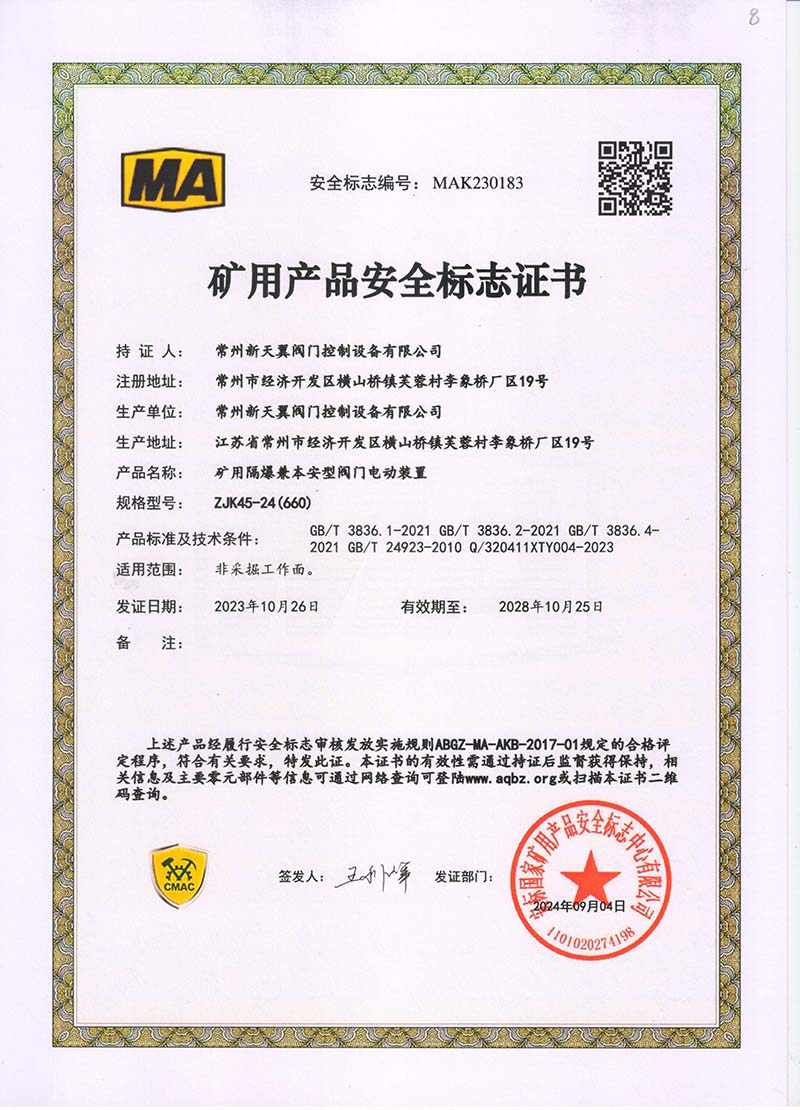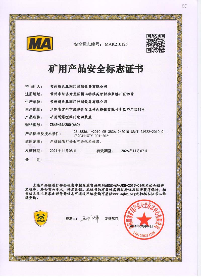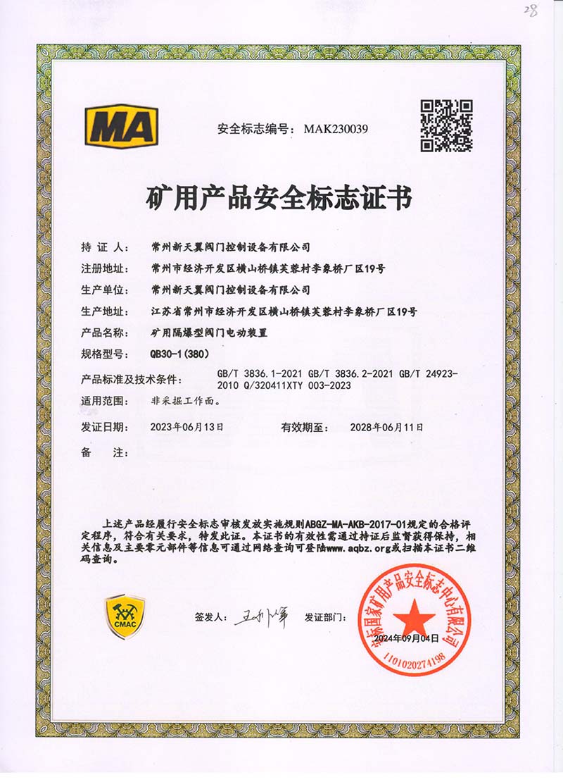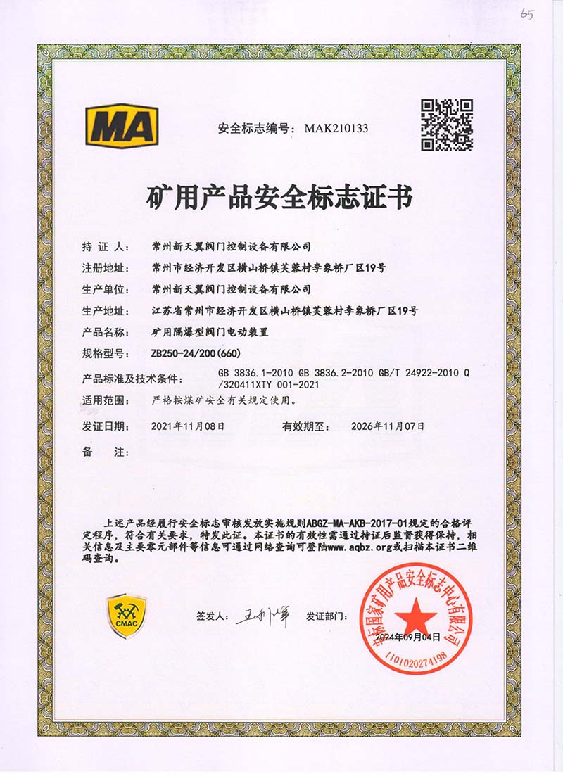 礦用產(chǎn)品安全標志證書ZB30-24 200(660)