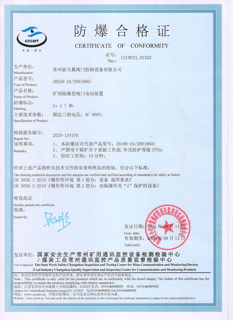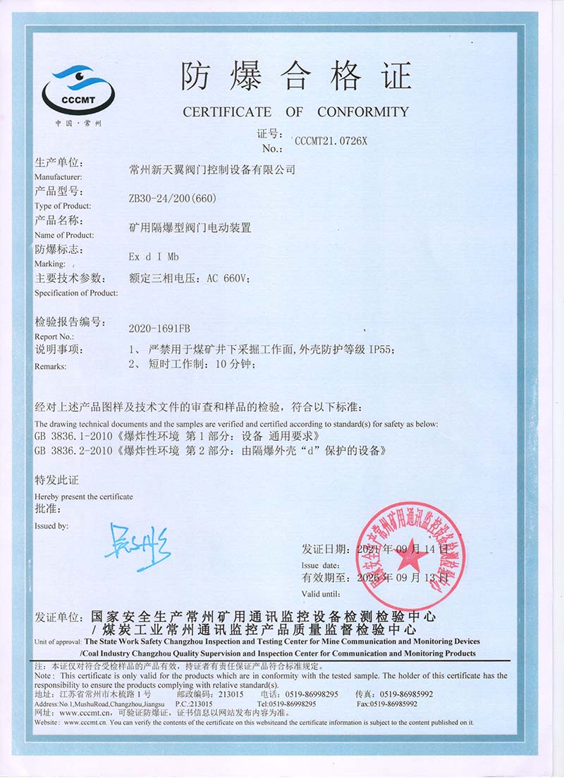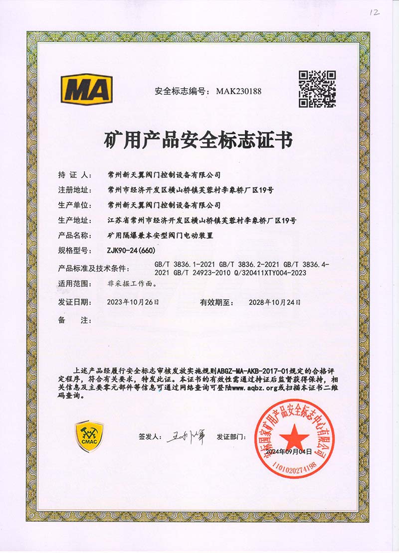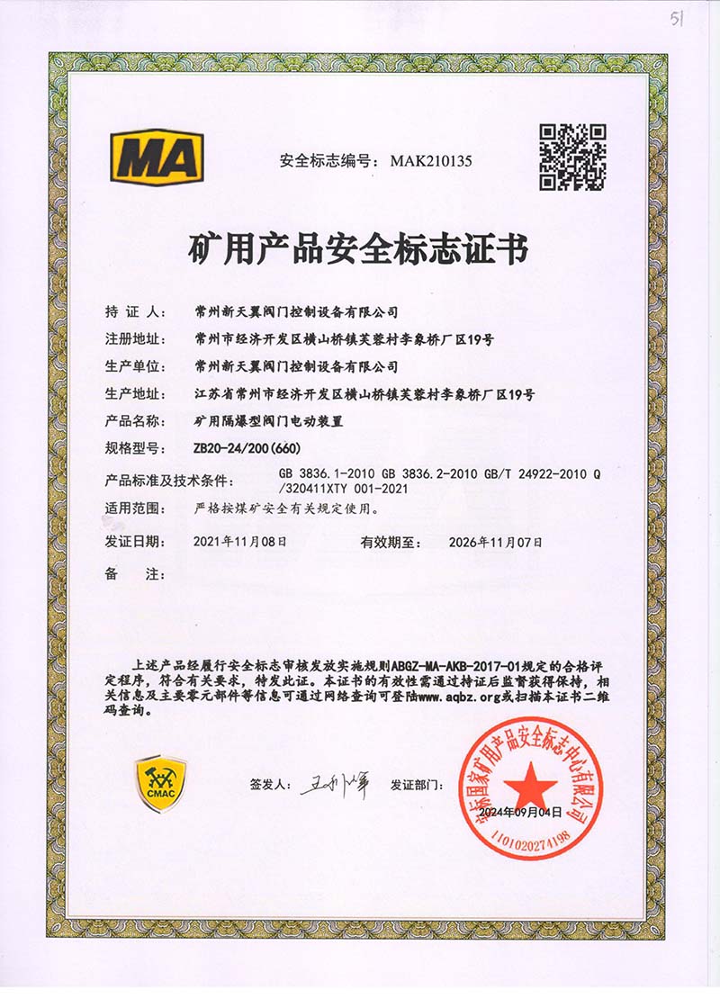 礦用產(chǎn)品安全標志證書ZB30-24 200(660)
