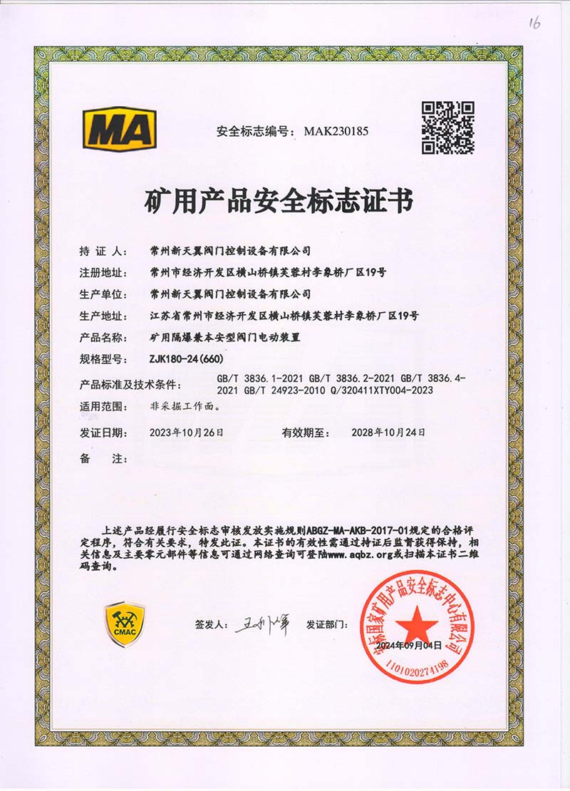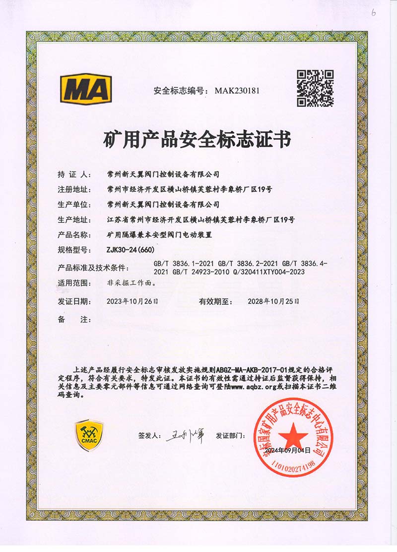 礦用產(chǎn)品安全標志證書ZJK180-24(660)