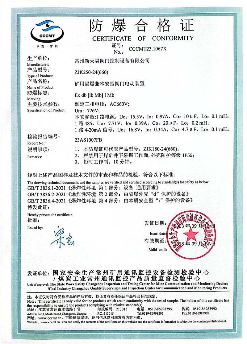 礦用產(chǎn)品安全標志證書ZJK250-24(660)