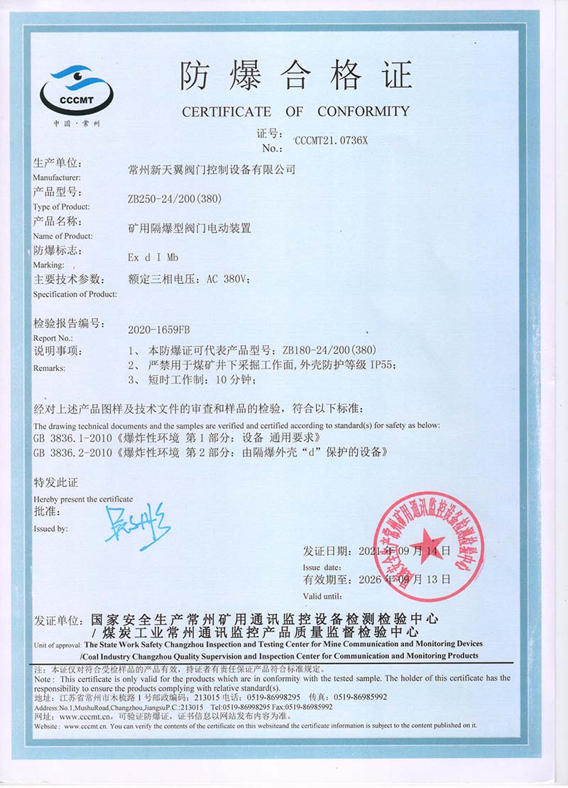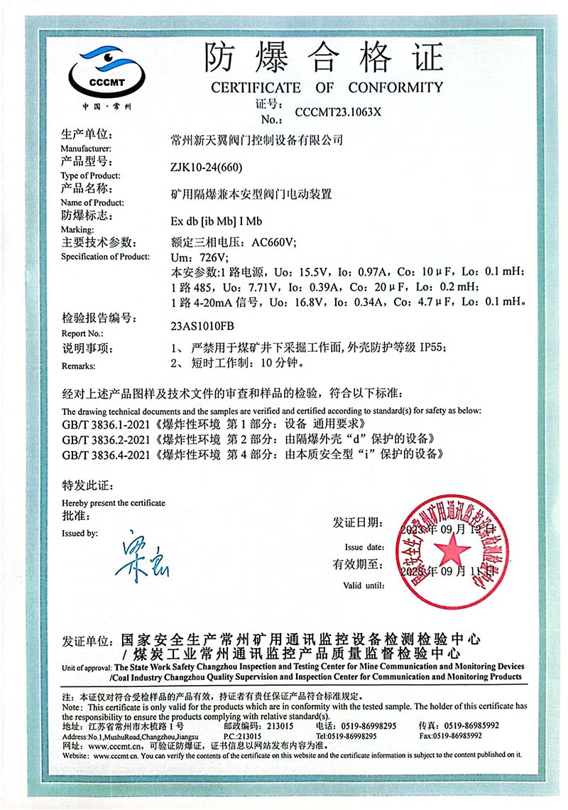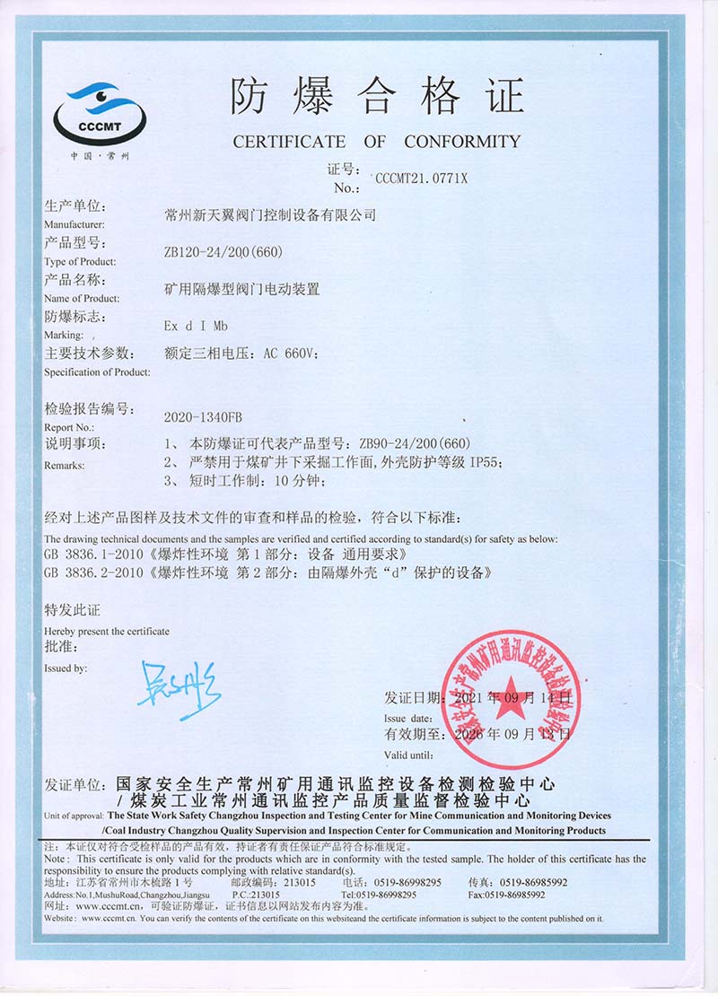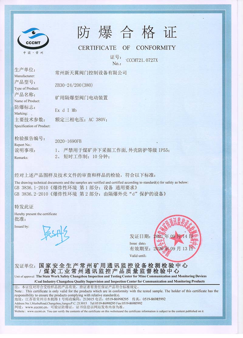 礦用隔爆ZB10-24中國國家強制性產(chǎn)品認證證書110.1