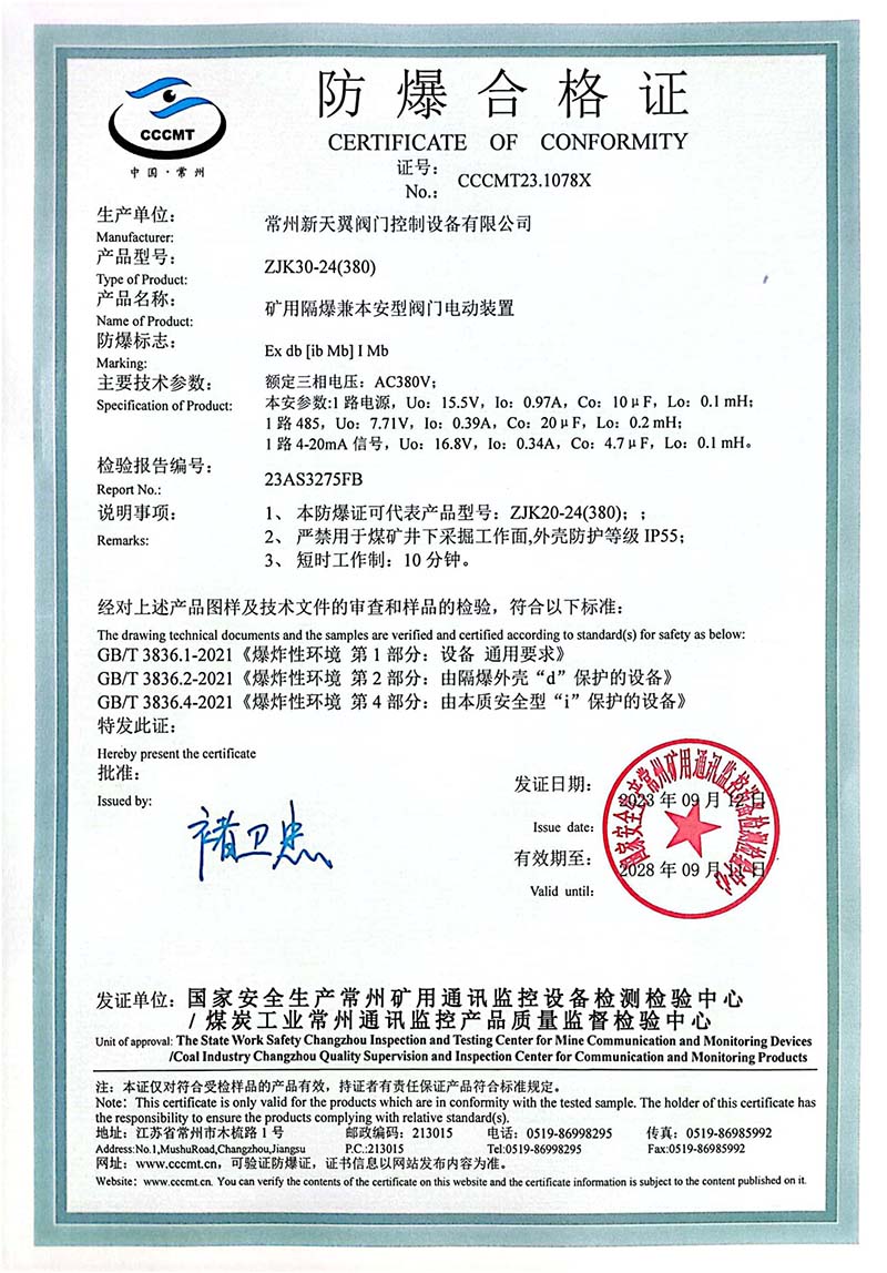 礦用產(chǎn)品安全標志證書ZJK30-24(380)