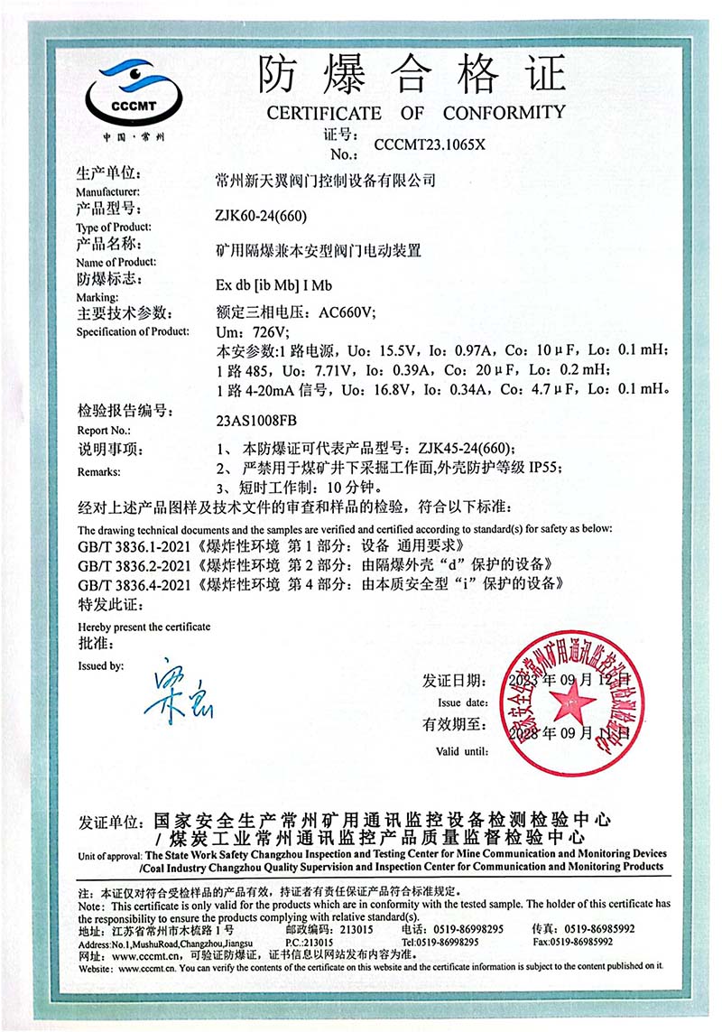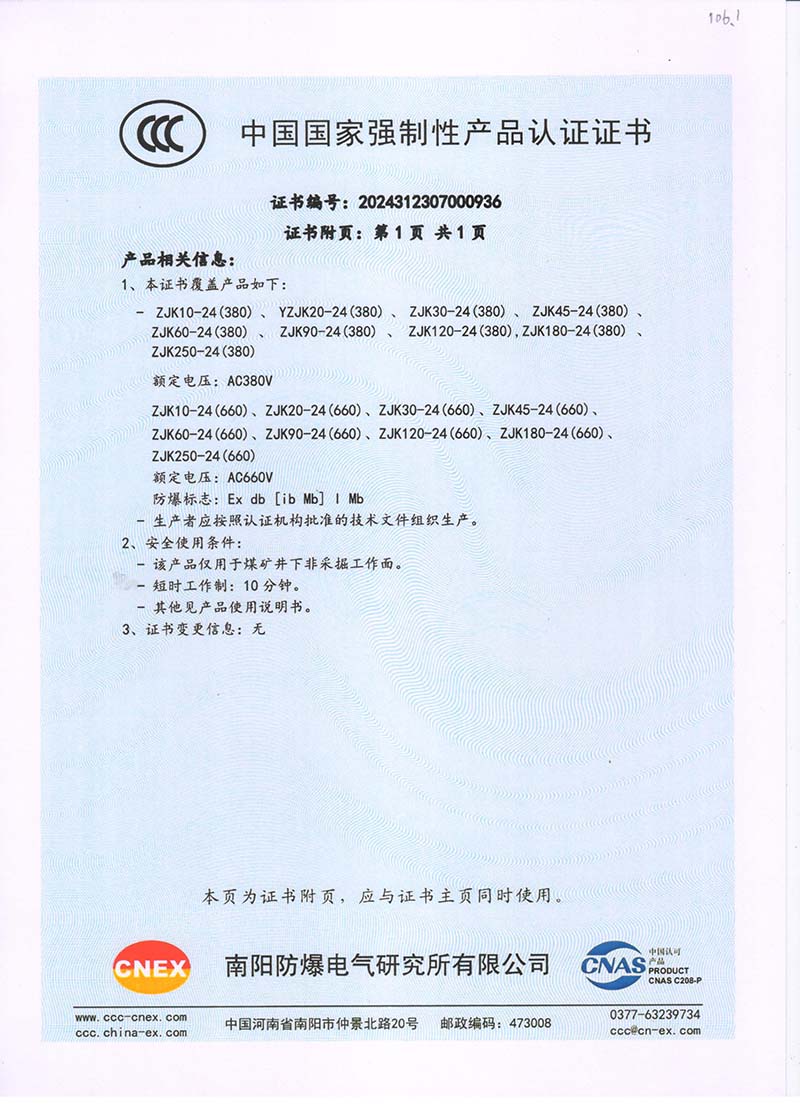 礦用產(chǎn)品安全標志證書ZJK60-24(380)