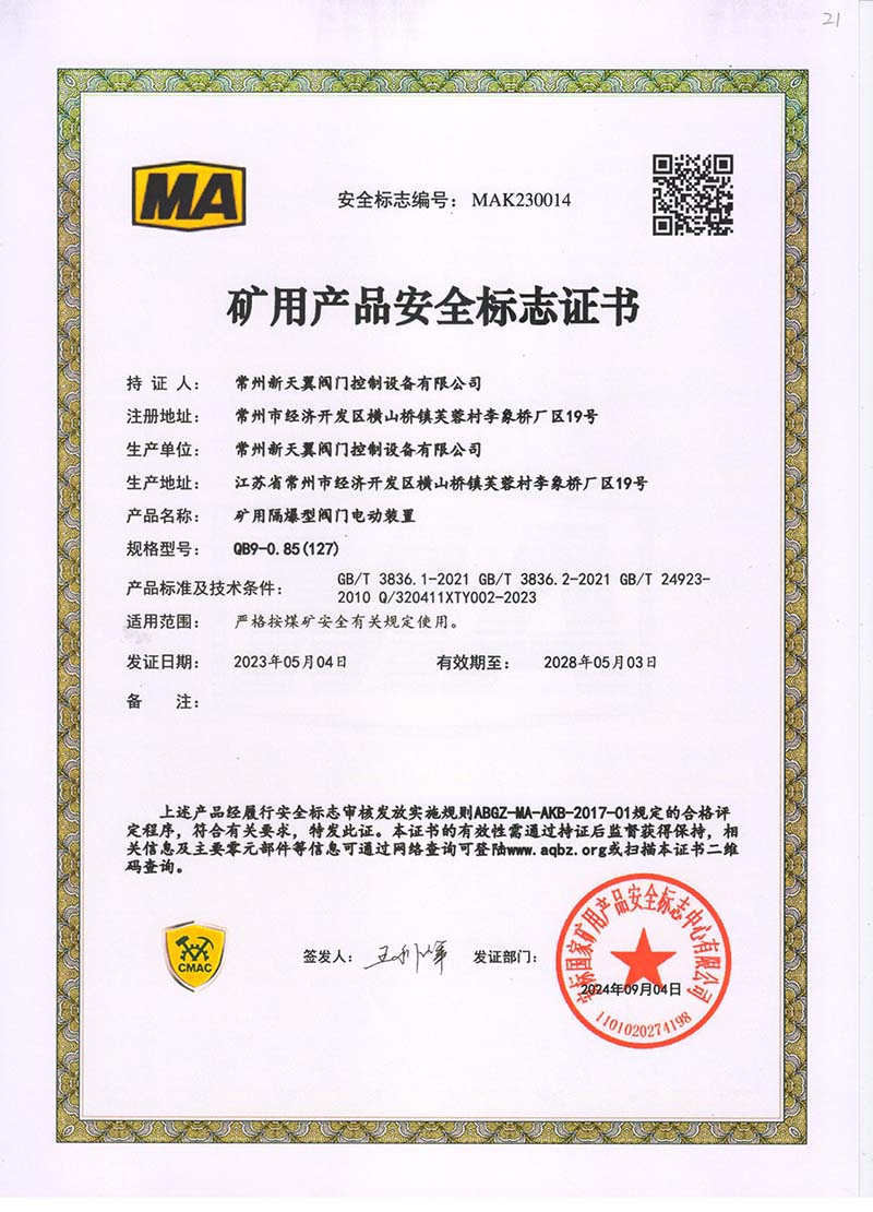礦用產(chǎn)品安全標志證書QB20-1(380)