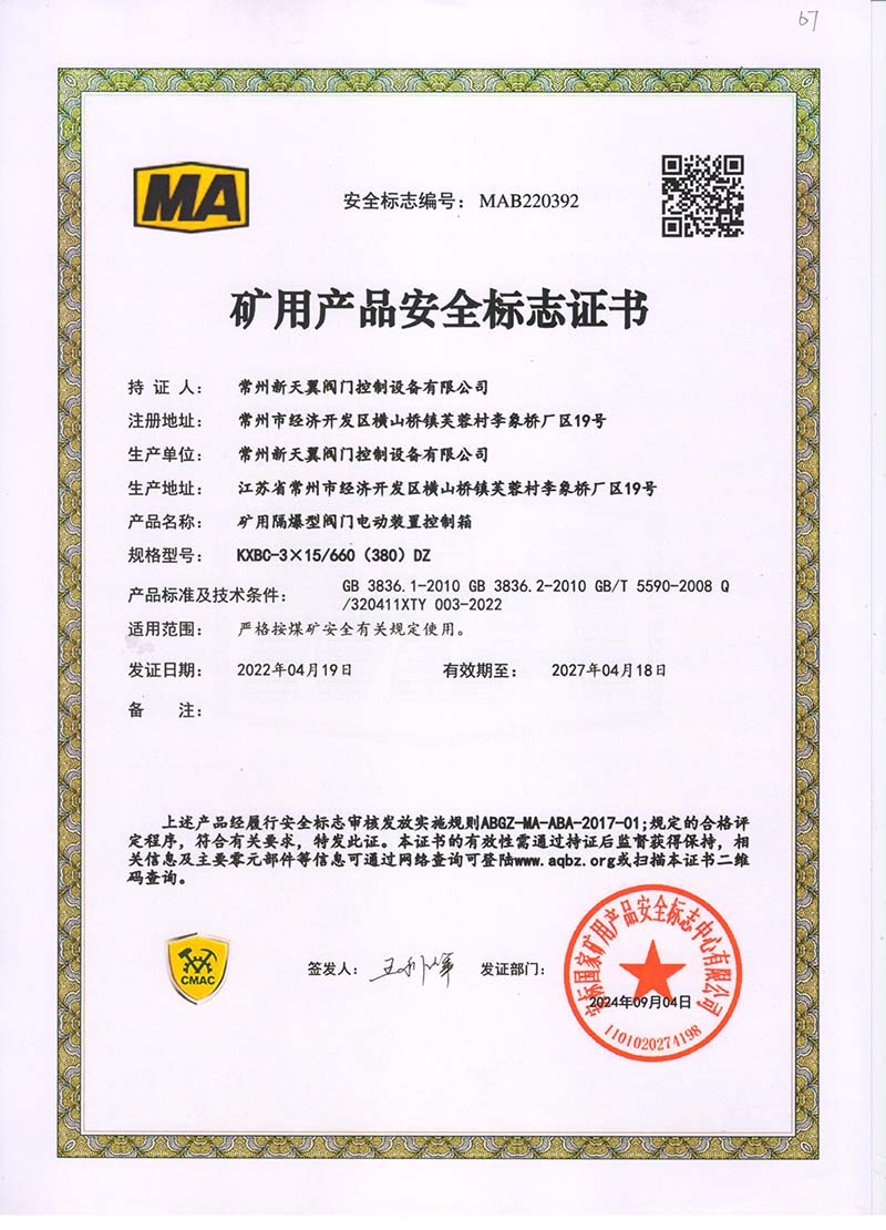 礦用產(chǎn)品安全標志證書ZJK180-24(380)