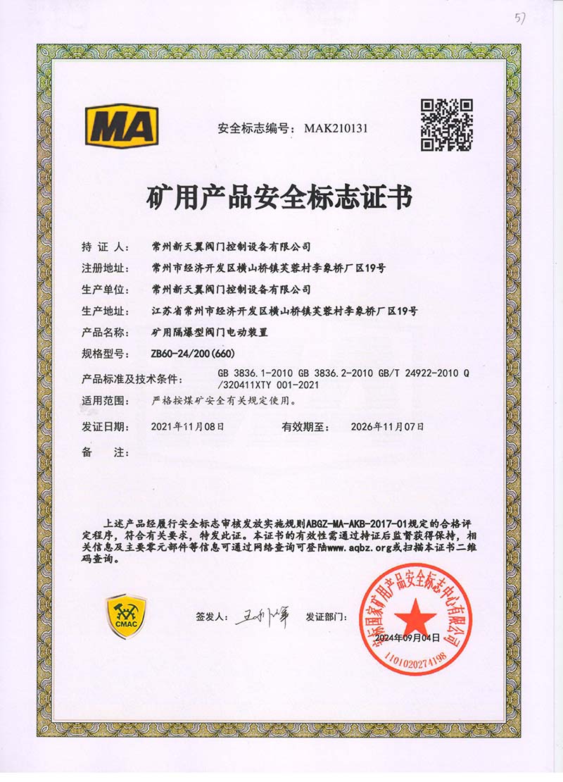 礦用產(chǎn)品安全標志證書ZB60-24 200(660)