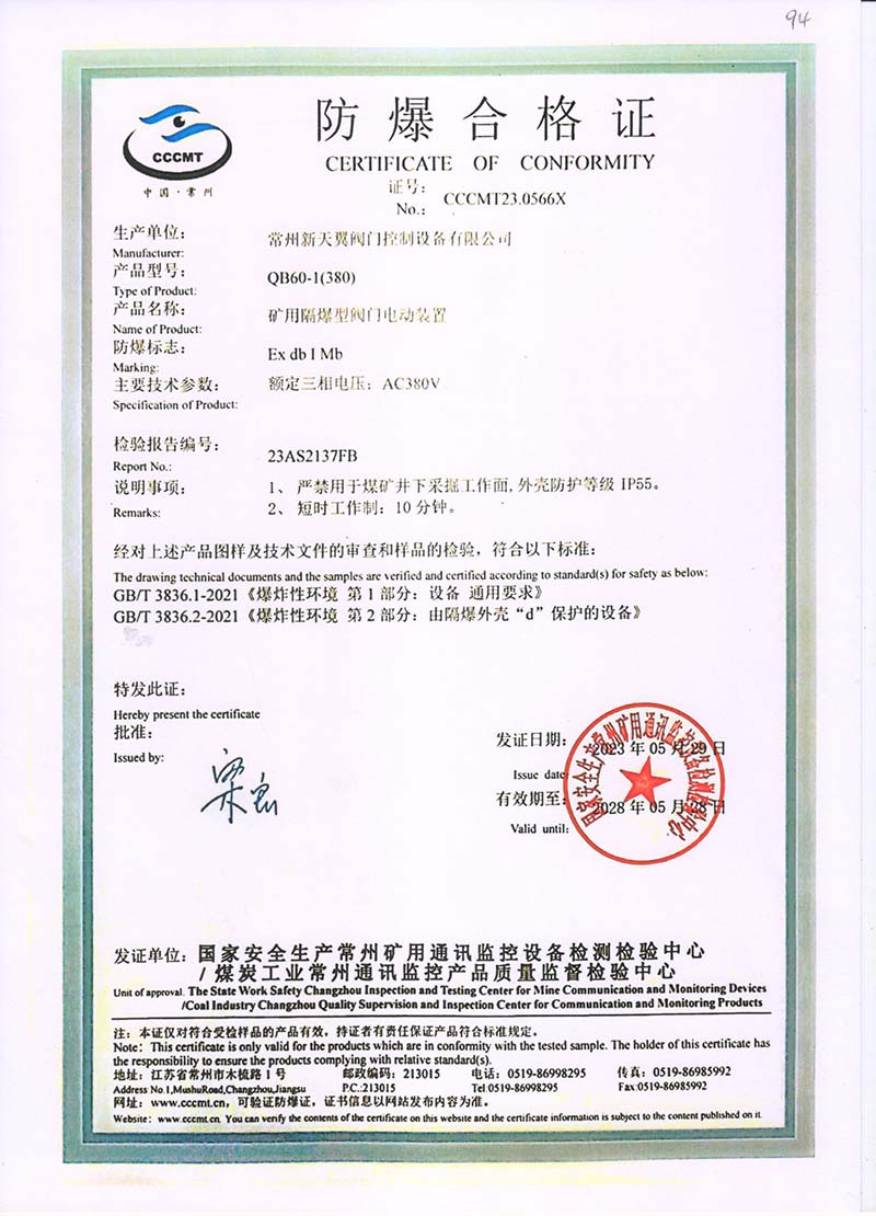 礦用產(chǎn)品安全標志證書QB60-1(380)