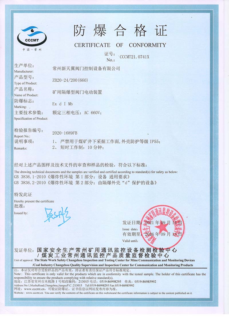 礦用產(chǎn)品安全標志證書ZB20-24 200(660)