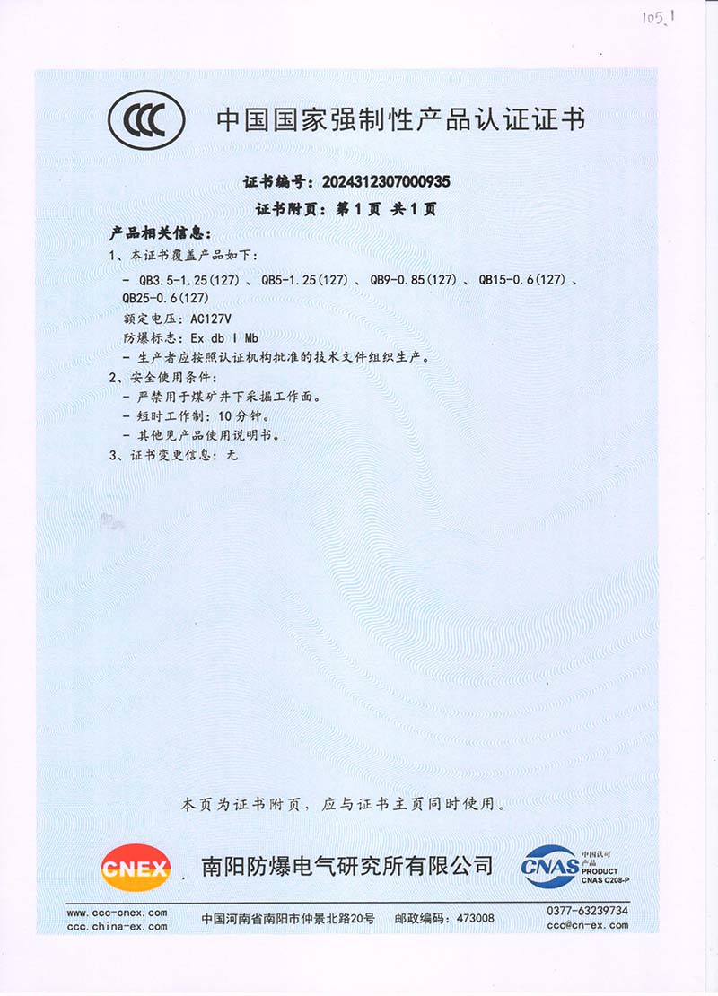 礦用隔爆QB127V 中國國家強制性產(chǎn)品認證證書105.1